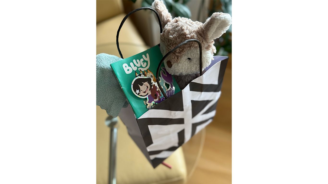 Baily loves playing with both mom and dad. She especially loves dad’s puppetry and drawings. This week she wanted to put together a present for him. The present held some of her well loved comfort items that help her feel better: soft towels, a beloved stuffed animal, some Bluey books and some stickers. Her understanding of the situation right now is that Oji doesn’t feel very good. I am thankful that she’s developed a loving relationship with dad already. One where she not only feels cared for by him, but wants to care for him in her own special, innocent way.